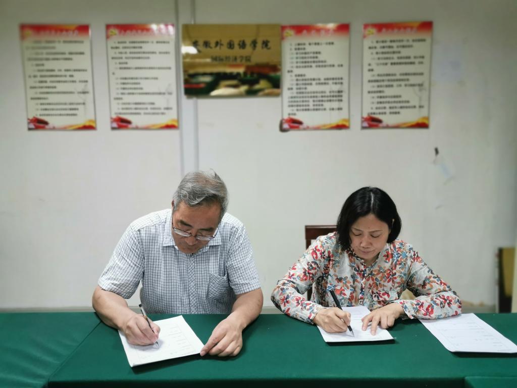 安徽外国语学院国际经济学院与安徽省进出口商会举行签约仪式后,高茜和王敏智两位领导共同为“产学研合作教育基地”揭牌并合影留念。