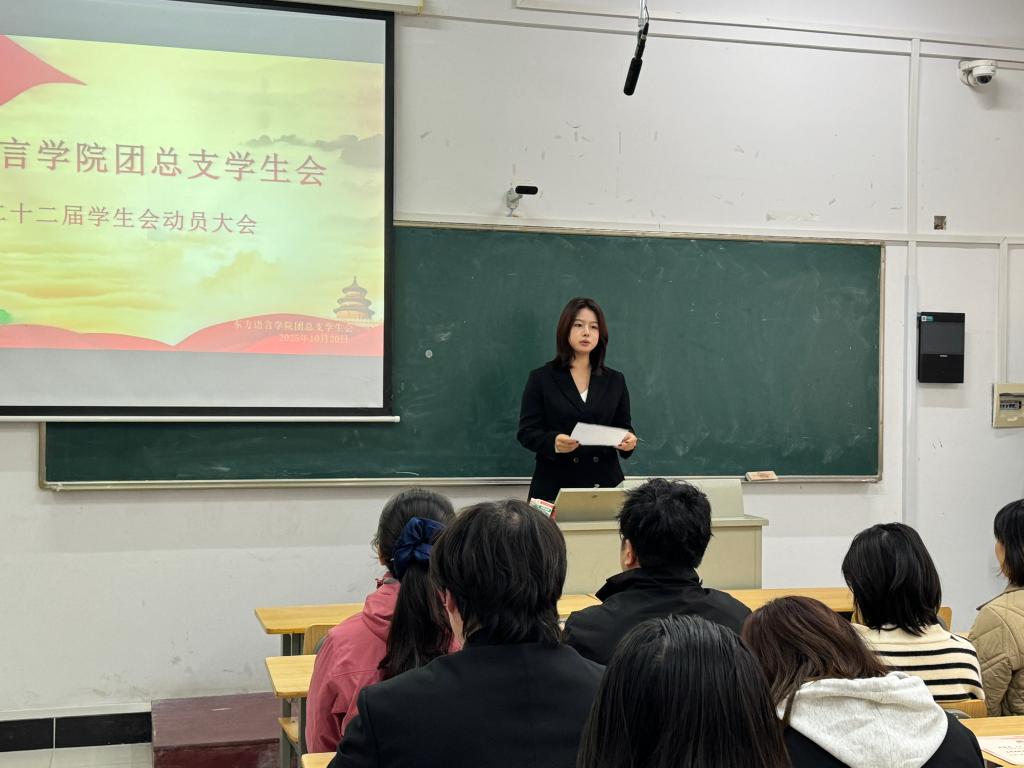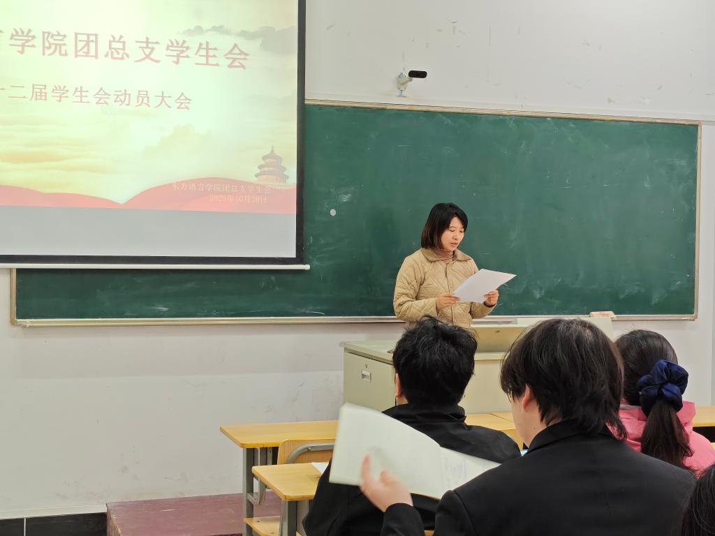东方语言学院党总支副书记刘法英,东方语言学院团总支书记、东方语言学院学生第一党支部书记孙文,东方语言学院党总支宣传委员张思,东方语言学院学生第一党支部纪检委员刘馨月,及新老学生会干部干事代表沈子嘉、周静雯、于庆瑶等参与本次大会,大会由杨晨曦主持。