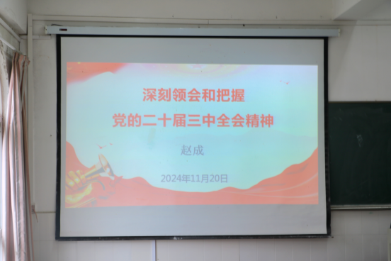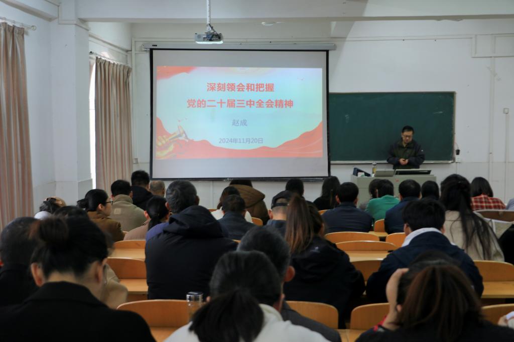 为进一步深入学习贯彻党的二十届三中全会精神,更好地用党的创新理论统一思想、凝聚共识,提高政治站位,安徽外国语学院在全校范围内开展学习贯彻党的二十届三中全会精神宣讲。11月20日,信息与数学学院、体育教学部直属党支部(以下简称信体党支部)邀请马克思主义学院教授赵成以“深刻领会和把握党的二十届三中全会精神”为题开展主题宣讲活动。信体党支部、机关直属党支部和马克思主义学院直属党支部全体党员参加。