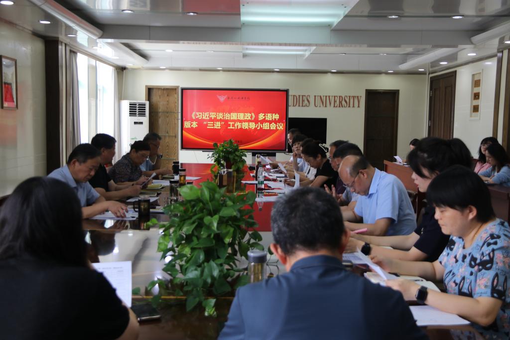 7月9日下午,学校在行政楼二楼会议室召开《习近平谈治国理政》多语种版本 “三进”工作推进会,“三进”工作领导小组成员参加会议,会议由校长周之虎主持并作总结讲话。