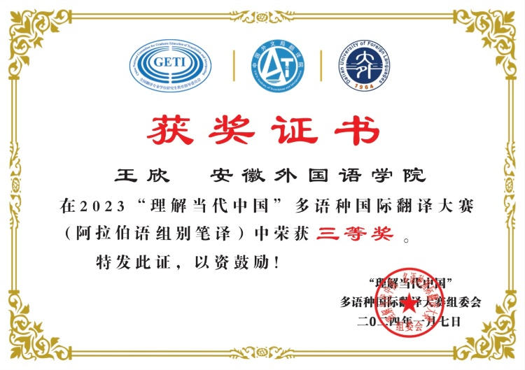 为深入学习贯彻习近平新时代中国特色社会主义思想,在学校的精心组织下,我校东方语言学院21级阿拉伯语专业王欣同学在狄璇老师的指导下,于2023年10月参加了2023“理解当代中国”多语种国际翻译大赛,近日比赛结果进行公布,王欣同学荣获了阿拉伯语组别笔译三等奖。