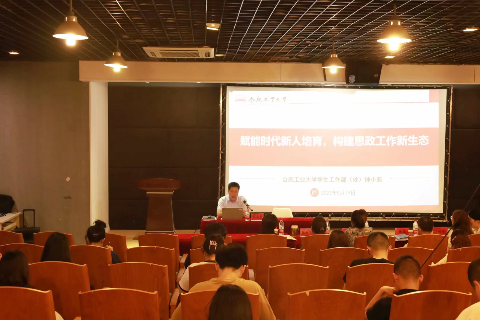 5月19日下午,第三届全国高校辅导员年度人物、合肥工业大学党委学工部部长钟小要受邀在图书馆一楼放映厅做专题辅导报告。专题辅导员报告会由副校长杨光主持,各二级学院专职副书记、全体辅导员、学生处参会。