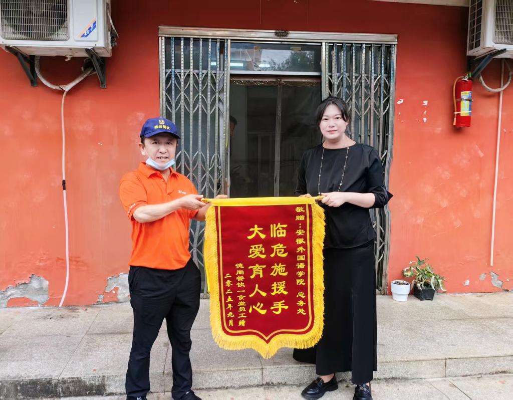 9月12日,在我校新生报到当天中午,一食堂一名工作人员突发身体不适,经校总务处快速响应、妥善处置,员工得到及时救治并已转危为安。今日,该食堂负责人及员工家属特地来到总务处,送上书有“临危施援手,大爱育人心”字样的锦旗,以表达对总务处人员的感激之情。