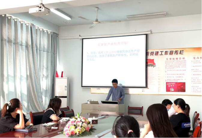 本次“党史故事汇”由杨卫东和章婧婷两位辅导员主讲。杨卫东讲述的主题是“改革开放”。他强调了“改革开放”分为“对内改革”和“对外开放”两个方面。他重点介绍了家庭联产承包责任制的背景、内容、特点和意义,并运用深圳经济特区的例子展示了对外开放的背景和意义。