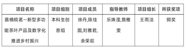 近日安徽省教育厅公布2024年安徽省大学生创新大赛获奖名单,我院王雨洁、徐丹、陈佳囡、刘雅君、余荣前五位同学组成的队伍在本科创意组中获得铜奖。