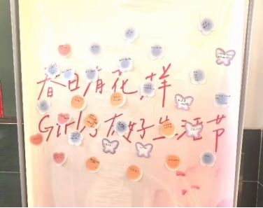 “永远记得爱自己”“拒绝内耗”,在场的男生女生们热情高涨,纷纷拿起笔,在卡片上写下对女生们真挚的祝福。同学们伏案书写的专注身影与逐渐填满的祝福墙,将清晨的寒意化作融融暖意。一张张承载着满满心意的便利贴被张贴在展示板上,形成了一片“祝福的花海”。