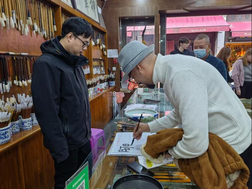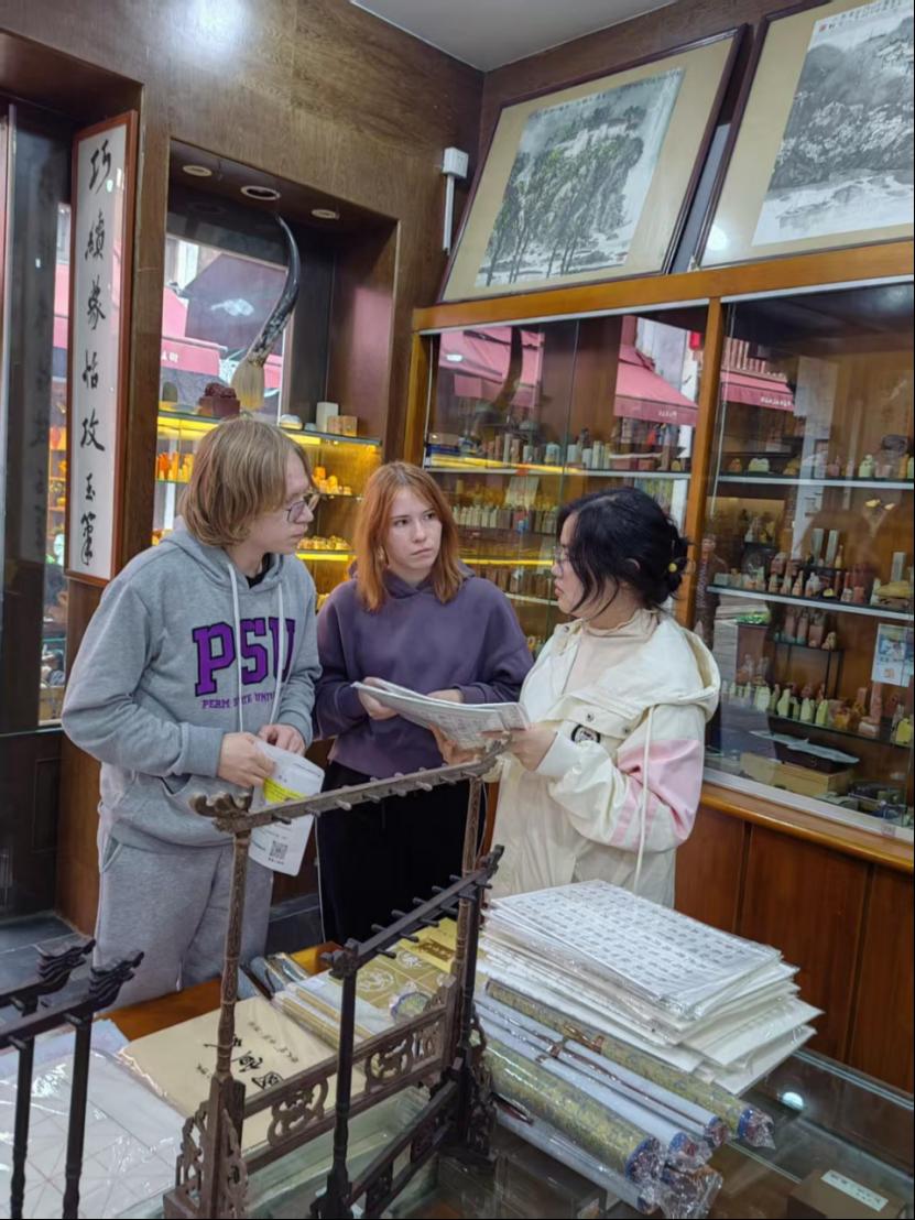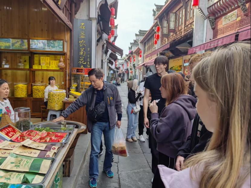 活动首日,团队来到了承载着深厚徽州文化底蕴的屯溪老街。漫步于青石板路上,两侧古朴的徽派建筑立刻吸引了大家的注意。国际交流处成员个个充当老师,亲自为外籍师生们充当“文化解说员”,细致讲解安徽独特人文地理背景下的茶文化,徽派建筑中粉墙黛瓦、马头墙的鲜明风格,以及“四水归堂”等布局背后所蕴含的聚财纳福、天人合一的传统哲学思想。在文房四宝店铺里,文传学院对外汉语教师陈凡耐心介绍了宣纸、徽墨、歙砚、湖笔的历史与制作工艺,引导大家感受中国古代文人雅士的精神世界。阿拉伯语外教Ali现场体验了中国的书法艺术,赞叹中国文化艺术的博大精深。此外,品尝臭鳜鱼、毛豆腐等特色徽菜的过程,更让大家从味蕾体验了地道的徽州风情。