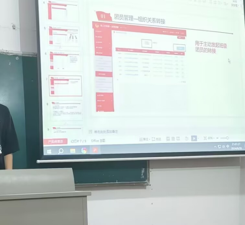 会议一开始,茆思凡同学便向大家介绍了智慧团建的使用方法。通过对“组织首页”、“教育实践”、“团员管理”和“操作中心”四个模板的介绍,让24届的各位班、团干部对智慧团建的操作有了基本认知。而后更是介绍了组织关系的转接以及团员信息、团内会议的录入等一系列注意事项,让24届的各位班、团干部对基本操作流程有所了解。