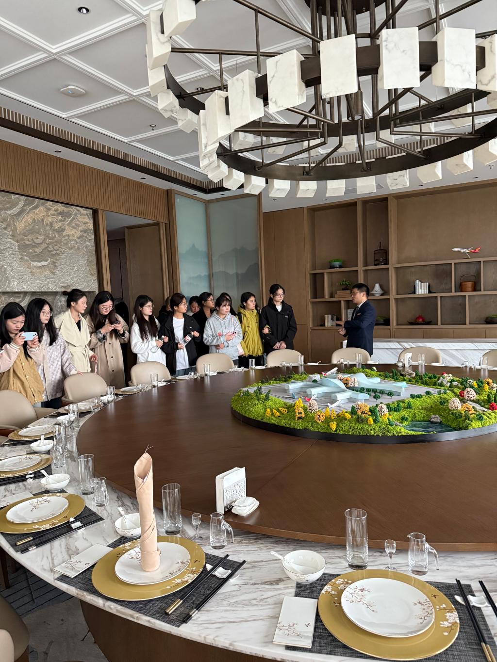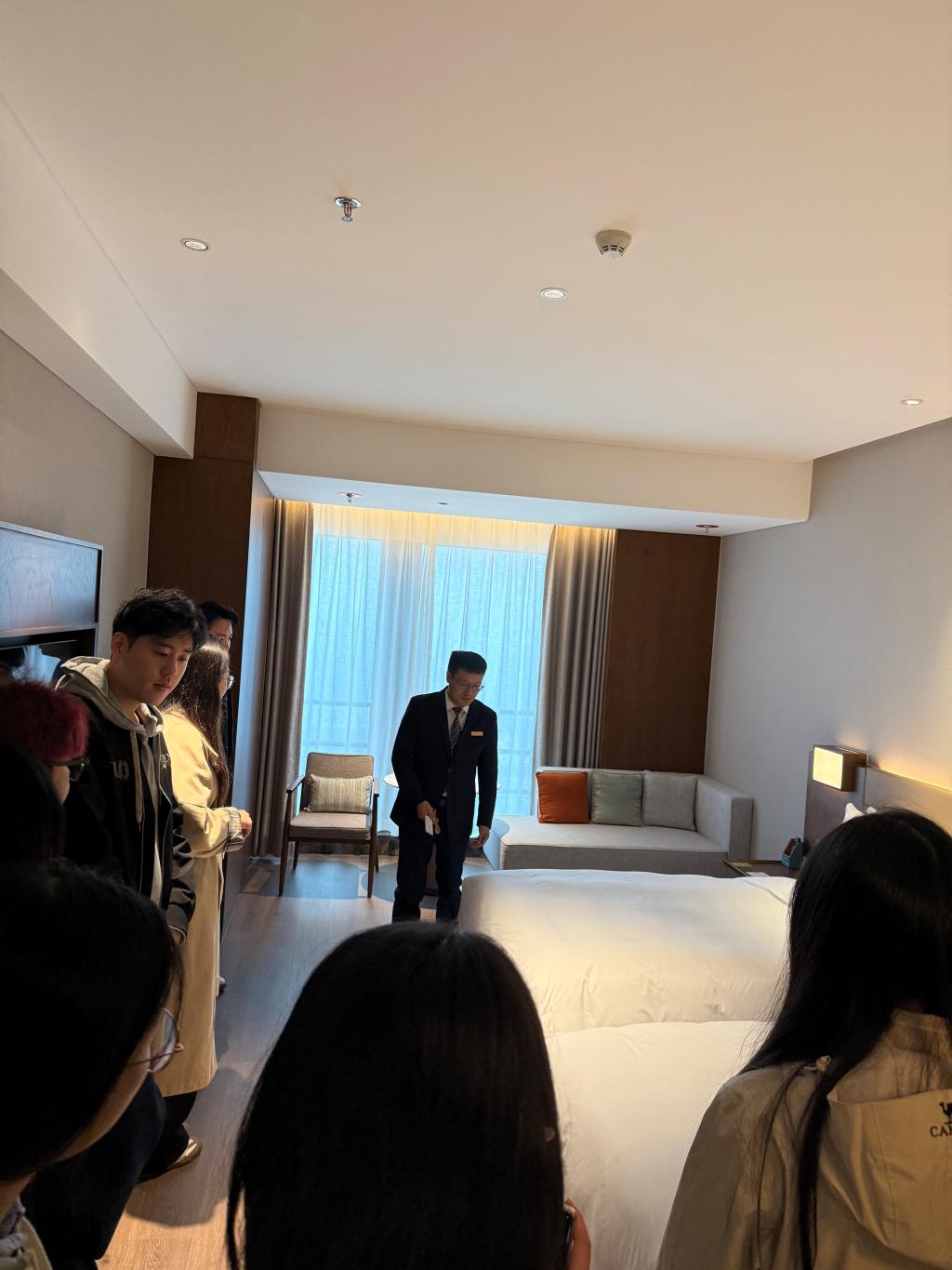 师生一行抵达饭店后,受到人力资源部总监汤平安及前厅部、管家部等管理团队的热情接待。随后学生分为三组,在房务总监、管家部经理和人资总监的分别带领下,有序参观了大堂、中餐厅、自助餐厅、各类客房及会议室等功能区域,参观中展现出良好的专业素养。