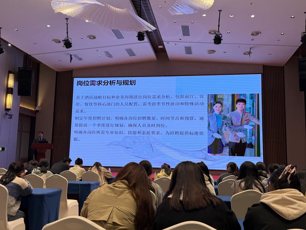 参观结束后,全体师生在君澜厅开展培训。前厅部主管以《前台预订系统操作》为题进行实操培训,内容贴合一线运营;汤平安总监则结合自身从业经验,围绕《君澜品牌介绍与高星级饭店人力资源管理》讲解了饭店人力资源管理核心要点与职业发展路径。培训期间,学生们认真听讲、积极互动,就专业相关问题踊跃提问,现场氛围热烈。参与学生表示,此次实践课程让他们对高星级饭店运营管理有了更直观深入的认识,增强了专业认同感与就业信心。
