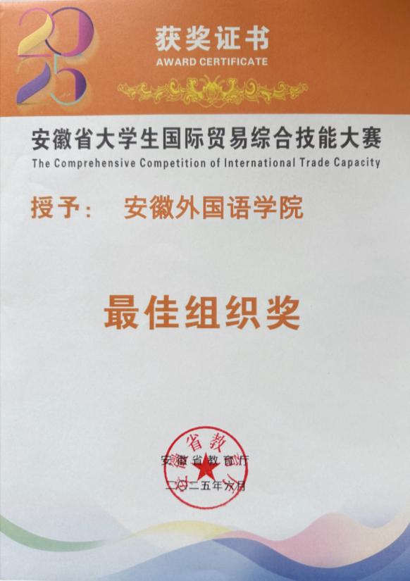 由安徽省教育厅主办的2025年安徽省大学生国际贸易综合技能大赛圆满落幕,国际商务学院作为我校此项大赛的承办单位,在教务处的指导下,凭借出色的赛事组织与扎实的育人成果,获“最佳组织奖”。