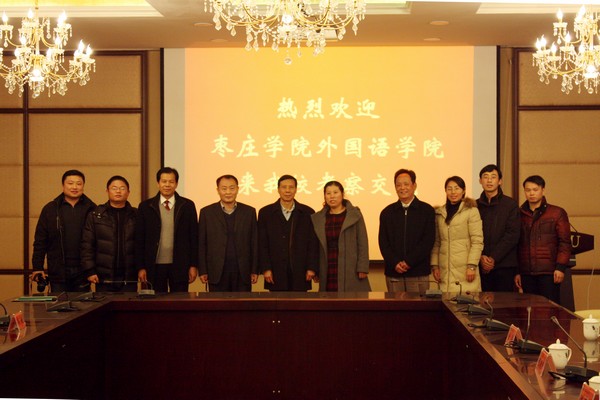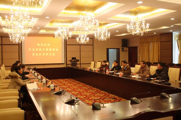 2013年12月9日,山东枣庄学院外国语学院院长韩建侠、党总支书记晁永国、副院长宋明峰、教研室主任褚夫敏、冯振、团总支书记丁聪一行六人来我校考察交流工作。学院副院长洪增流教授在院图书馆会议室热情接待了来宾,西方语言学院院长李永平、国际商务学院院长程敏然、东方语言学院院长助理黄周、教务处副处长刘勇等参加了交流会。