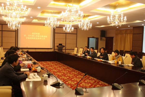 洪增流副院长详细汇报了我院2013年的外事工作。我院扎实推进外事工作,具有丰富的外教资源和规范、人性化的管理体制。现有外籍教师涵盖了法语、德语、西班牙语、韩语、英语、俄语和英语七个语种,保证了每个外语语种都有外教授课,为学生提供了纯正的口语学习环境。他总结了我院外教管理工作的主要成绩和经验,并就外教资源共享等问题与检查组的同志作了交流。