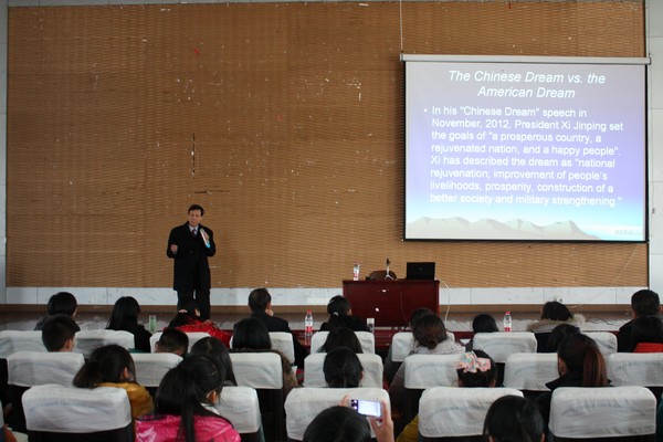 2013年11月27日下午,我院副院长洪增流教授在学术报告厅做了名为《Chinese Dream Vs. American Dream》的专题讲座,围绕“中国梦与美国梦”进行深入解读。大外部英语教师、西方语言学院教师、西方语言学院11级、12级英语专业学生和部分国商、国经、国旅学院的学生聆听了此次讲座。