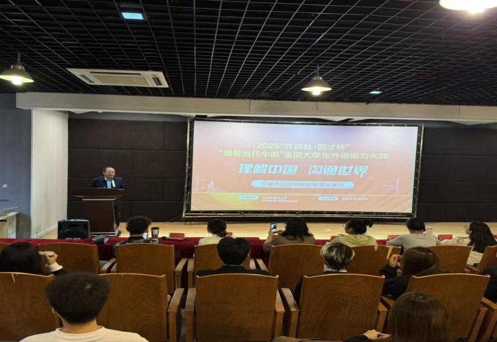 9月24日下午,2025年“外研社·国才杯”“理解当代中国”全国大学生英语演讲比赛安徽外国语学院决赛在学校图书馆一楼放映厅举行。本次赛事以“理解中国、沟通世界”为主题,旨在提升大学生外语应用能力与跨文化交际素养,助力青年学子讲好中国故事。此次比赛由英语语言学院院长周平致辞,屠后凯、侯梦怡主持。