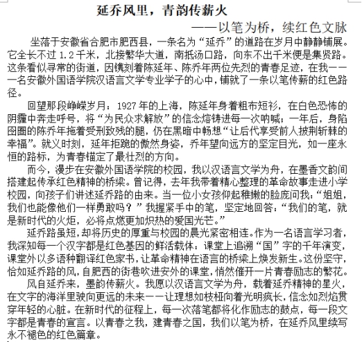 在“红色传承 青春韵笔”爱国主题征文活动中,同学们踊跃投稿,纷纷以笔尖传递真情。文章内容或追溯革命先辈的感人事迹,或结合自身成长经历畅谈对家国情怀的理解,或立足新时代展望青年一代的使命担当。一篇篇情真意切的文字,充分展现了我校学子深厚的爱国热情和积极向上的精神风貌。