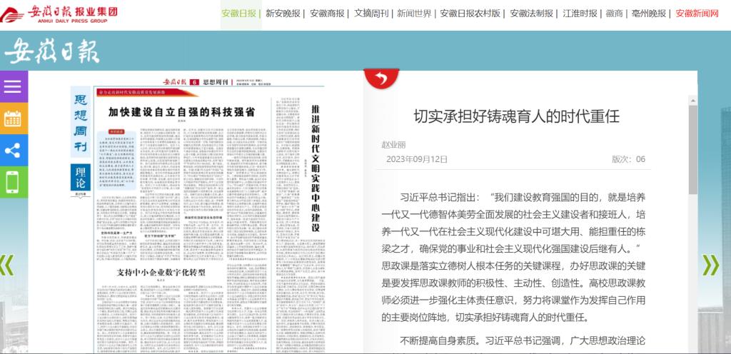 近日,《安徽日报》思想周刊理论版刊发了我校马克思主义学院赵业丽老师《切实承担好铸魂育人的时代重任》的文章。文章指出,高校思政课教师必须进一步强化主体责任意识,努力将思政课堂作为发挥立德树人作用的主要岗位阵地,切实承担好铸魂育人的时代重任。
