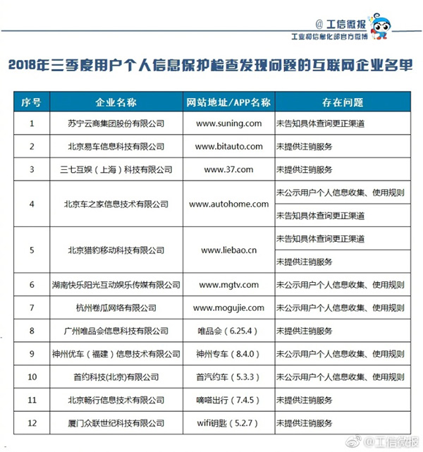 今年三季度,工信部对62家互联网企业65项互联网服务进行抽查,发现12家互联网企业存在未公示用户个人信息收集使用规则、未告知查询更正信息的渠道、未提供账号注销服务的问题,已督促整改。
