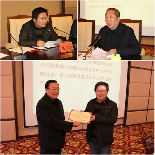 同时,徐玉祺作为获奖教师代表以及魏名国教授作为思政课教师代表在大会做了交流发言。徐老师作为青年教师,主要结合思政课教学实际,谈了几点个人的见解和认识,他认为思政课首先要深入学生生活和内心深处,帮助学生正确认识社会现象,使学生掌握马克思主义的立场观点和方法,提高观察问题和分析问题的能力;其次强调思政课在教学过程中要充分尊重学生主体,在教学方式上避免满堂灌,通过讨论式教学提高思政理论课实效性;最后,他还结合自身在实践互动教学和PPT教学中的困惑谈了几点认识。魏老师作为一名有着丰富教学经验的思政课教师,结合了他多年来教学的个人感悟,谈了在新形势下创新思政课教学的几点建议。两位老师的发言务实、诚恳,具有针对性和操作性,获得一致好评。