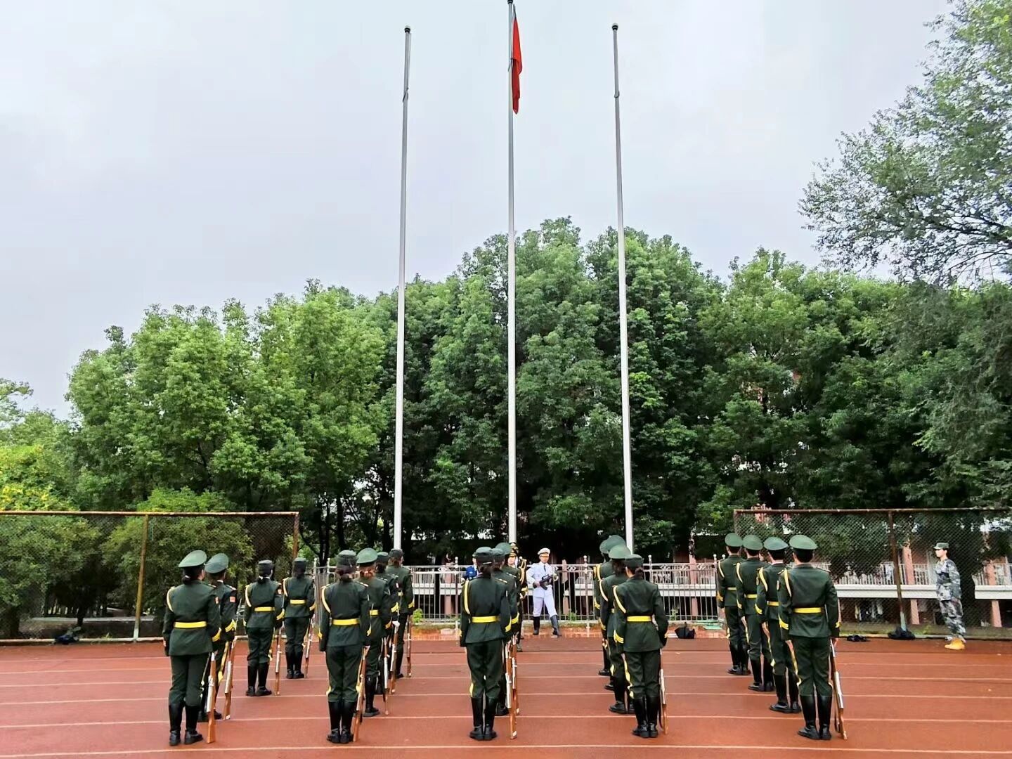 国旗护卫队的成员们将国旗护送至旗杆下,伴随着雄壮的国歌声,五星红旗冉冉升起,军训结营仪式拉开帷幕。