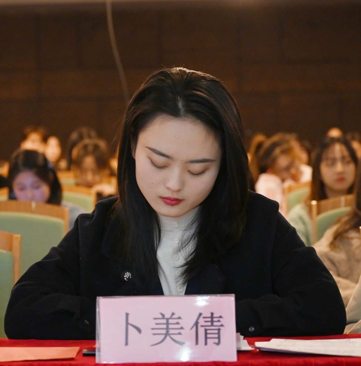 随后,团总支书记、学生会指导老师卜美倩上台为大会致辞。卜美倩老师对学生组织过去一年的工作成绩表示肯定和感谢,同时对在场成员们提出了三点要求:一是作为组织的一员同时也就是组织对外的“名片”,要严格要求自己的言行举止,在院内起到模范作用;二是加入部门锻炼自己的同时也需要牢记自己的本职工作仍是学习,只有两面开花,才算真的有所收获;三是要拒绝内部官僚主义,每一个院内组织的根本目的与主旨都是服务同学。