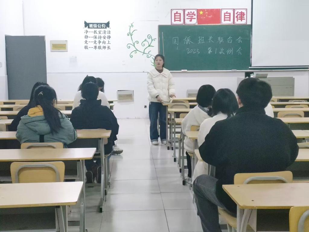 本次会议主要是安排布置新学期班联的各项工作和任务。国旅班联副主席张静怡首先对本学期工作提出几点要求,一是要注意本班的考风考纪问题,二是注意每个早自习的站岗,以及早晚自习查班,每周五上午的卫生检查也要开始安排,即使班联成员有所改变,但是班联的职责必须认真履行,三是班级的安全稳定工作,尤其是高度重视防电诈的宣传教育工作。