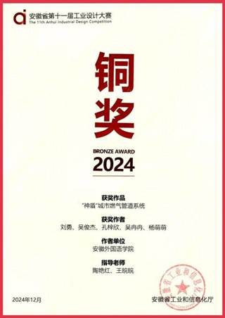 在2024年“安徽省第十一届”工业设计大赛中,我校与安徽中医药大学联合,由刘勇老师为主创的作品《揉灸仪》和由孔梓欣、吴冉冉、杨萌萌设计,陶艳红、王皖皖老师指导的作品《“神盾”城市燃气管道系统》夺得省赛铜奖。