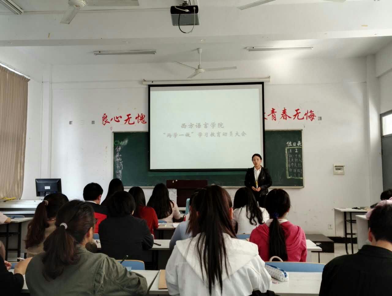 为学习贯彻中央和省委关于在全体党员中开展“学党章党规、学系列讲话,做合格党员”学习教育方案的文件精神,推动全面从严治党向基层延伸,西方语言学院于2016年4月27日下午三点半,在二教401教室召开学生党员“两学一做”学习教育动员大会。参与本次会议的有西方语言学院党总支副书记张立志、党总支组织委员辛刘方、宣传委员施芳芳、教职工第三党支部书记张影以及西语学院全体学生党员。会议由西语学生第一党支部副书记朱文玲主持。