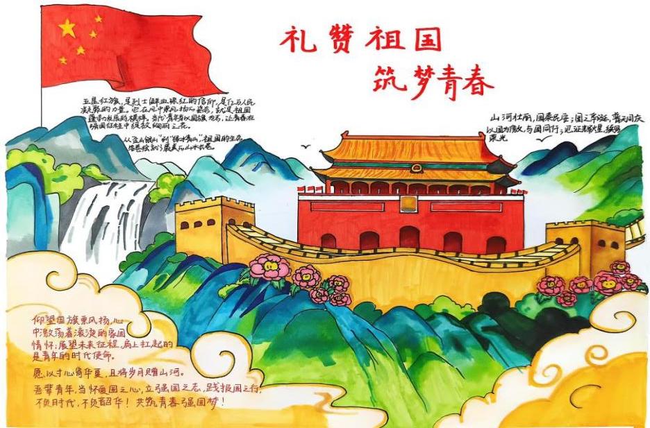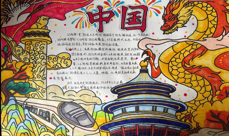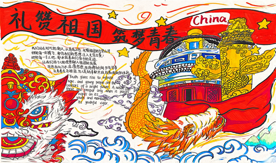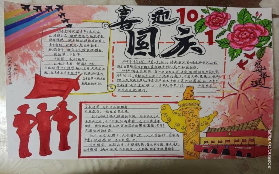 在手抄报创作里,同学们巧妙融合了天安门、华表、天坛等标志性建筑,凭借明快浓烈的色彩,精准勾勒出寓意深远的“盛世祥和”图景,让爱国情怀在笔墨间自然流淌。