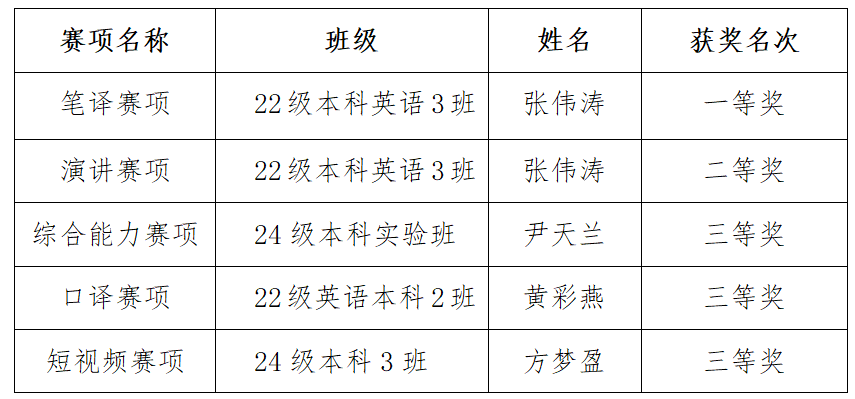 此次省赛“大满贯”不仅彰显了我校在外语人才培养领域的领先地位,也为学院更好发展“以赛促学、以赛促教、赛教融合”做了示范。未来,学院将继续以赛事为抓手,助力更多英语学院学子在国际舞台上传递中国声音,展现青春风采。(撰稿:郭睿源 审稿:韩璐)