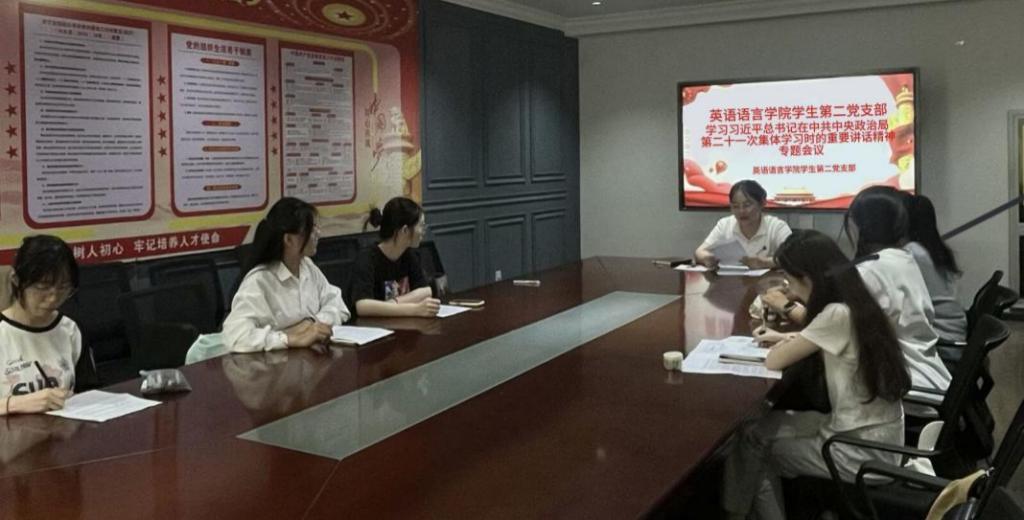为深入贯彻落实习近平总书记在中共中央政治局第二十一次集体学习时的重要讲话精神,英语语言学院学生第二党支部于9月15日14:00在西语楼101会议室组织开展了专题学习活动。会议由党支部书记高皓宇主持,全体党员参加。