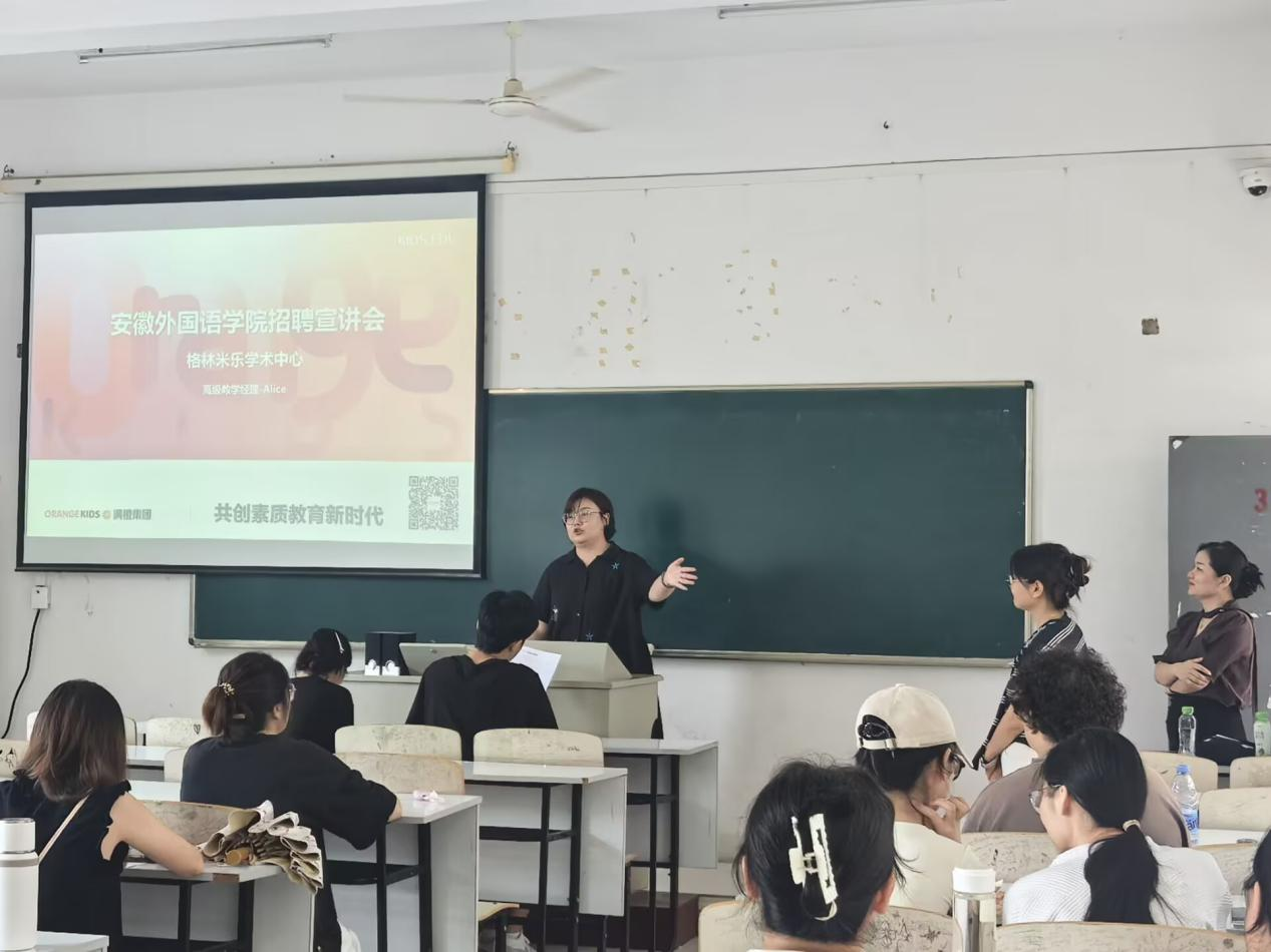 安徽满橙教育投资有限公司作为省内知名教育机构,此次派出了强阵容宣讲团队:格林米乐高级教学经理Alice、社区部教学经理Penny,以及怀宁校区综合体校长Catherine(安外2005届校友)共同登台。