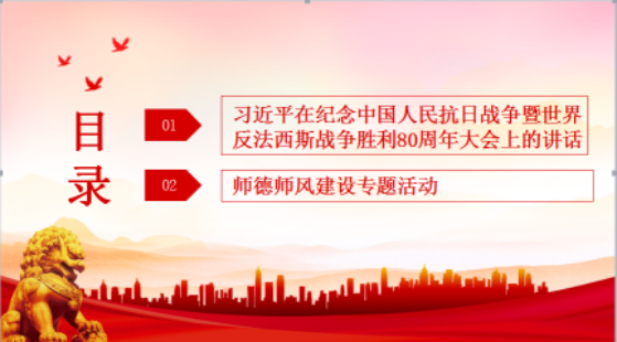 西葡语系主任、教工党支部第一党小组组长王凡,带领大家学习了习近平总书记在纪念中国人民抗日战争暨世界反法西斯战争胜利80周年大会上的重要讲话。讲话回顾了中国人民抗日战争的伟大历程,强调了这场战争的世界意义,并号召全体人民弘扬伟大抗战精神,践行新时代使命。通过学习,教职工们深刻认识到了抗战历史的重要性和抗战精神的伟大内涵,大家表示将从抗战历史中汲取精神力量,增强民族自豪感与责任感,在日常工作中践行伟大抗战精神,以更加饱满的热情投入到教育教学工作中。会上,学院开展了师德师风建设专题活动。党总支组织委员曹婕带领全体教职工深入学习了《新时代高校教师职业行为十项准则》,并通过剖析典型案例开展警示教育。全体教职工深刻认识到了师德师风建设的重要性,大家纷纷表示,将严格遵守教师职业道德规范,坚守教育初心,牢记育人使命,以实际行动维护教师的良好形象。