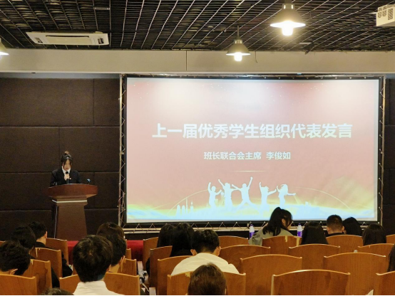 会上,许可芯宣读开场词,介绍到场嘉宾,大会按照既定流程顺利进行。上一届优秀学生组织代表、西方语言学院班长联合会主席李俊如上台发言。她表达了对给予指导的学院老师、并肩作战的团队成员的诚挚感谢,回顾了过去一年的重点工作,分享了个人的成长感悟,同时表达了对新一届学生组织的祝福。