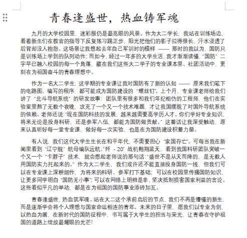 在“青春逢盛世,热血筑军魂”国防主题征文活动中,同学们踊跃投稿,结合个人经历与社会观察,用文字抒发了对强国强军事业的理解与支持,展现了新时代青年心系国防、勇于担当的赤子情怀。一篇篇情真意切的文章,反映了同学们对国家安全的深刻认知和强烈的家国责任感。