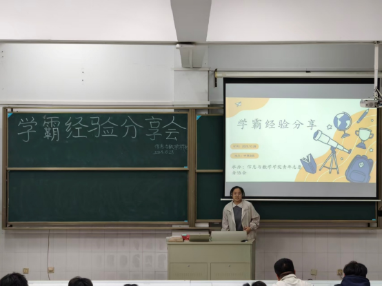 为充分发挥优秀学生的榜样引领作用,搭建青年学生成长交流的平台,10月28日晚,信息与数学学院在四教305教室举办“学霸经验分享会”,本次分享会邀请了本学年国家奖学金、国家励志奖学金以及在各个领域省级赛事奖项的获得者,进行了学习经验分享。