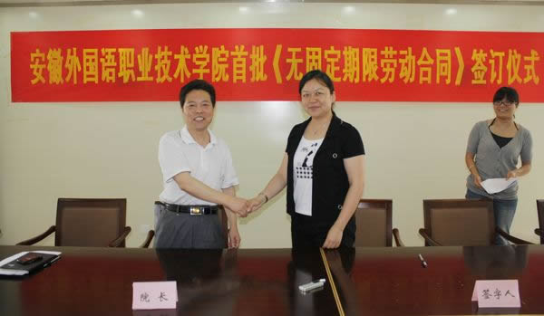 洪院长指出,本次无固定期限劳动合同的签订是学院全面贯彻《中华人民共和国劳动合同法》、深化人事制度改革的重要举措,是进一步加强和完善教职工队伍建设的重要体现,对于学院办学、升本及各项事业发展所需建设一支高素质的师资队伍具有重大的现实意义和深远的历史意义。学院办学8年来的快速、茁壮成长得益于改革开放的好时机,得益于党和政府的关怀,得益于董事会的英明决策,更得益于教职员工的辛勤工作和付出。参加签约仪式的都是学院的功臣,是学院昨天的骄傲,也是学院未来发展的基石和中坚。学院将抓住当前迎评的机遇大力加强师德师风建设;积极推进公共课、基础课教师完成硕士学位课程进修;鼓励支持优秀骨干教师在职攻读硕士、博士学位;完善教师职务评聘工作;效率优先、兼顾公平提高教职工工资待遇;逐步完善奖惩、晋升机制等。通过本次签约整体推进师资队伍建设,从而形成学院办学的新优势、新亮点。他鼓励教职工立足本职,坚持学习,以主人翁的姿态积极投入到如火如荼的升本准备工作中,并在未来的工作中不断提高思想政治觉悟和教育教学水平,成为优秀的高校教师。