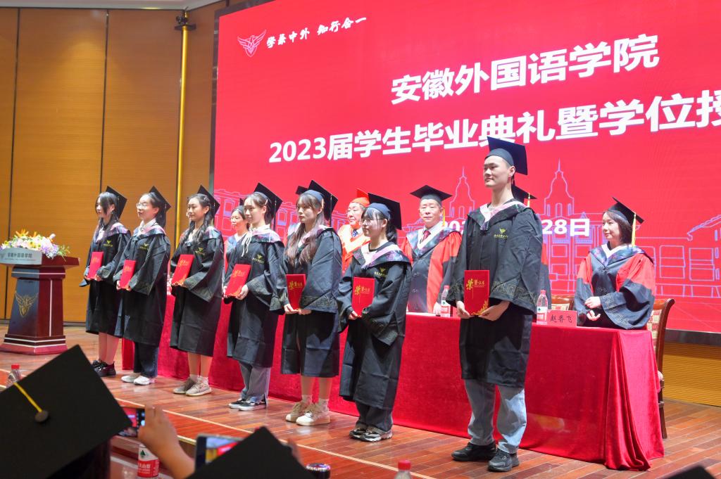 2023年6月28日上午,安徽外国语学院2023届学生毕业典礼暨学位授予仪式在学术报告厅隆重举行。校董事长、党委副书记、校长周之虎,党委副书记、常务副校长薛照明,副校长高茜,党委副书记、副校长童祖芬,校长助理赵香飞、高玉华出席大会,职能部门及二级学院主要负责人、辅导员代表、教师代表、2023届毕业生及家长代表、优秀校友代表等参加大会。典礼由副校长杨光主持。