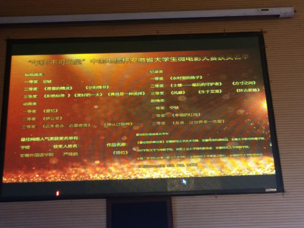 11月10日,安徽省首届微电影大赛颁奖典礼暨非遗进校园公益晚会在安徽财经大学举行。我院6名师生在院党总支副书记满德慧的带领下参加颁奖典礼。典礼上,我院15级网络与新媒体本科1班的严筱韵以及她的团队凭借作品《错位》获最佳网络人气奖。