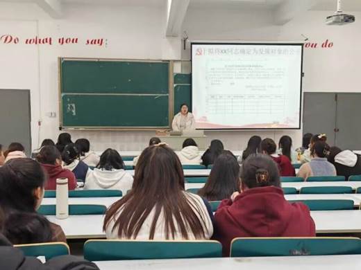 陈丽丽在会上向积极分子介绍了学生第六党支部的组织架构,对加入支部的积极分子表达了期许。会议着重强调了党员发展流程:成为积极分子至发展对象前需要每三个月定期撰写思想汇报等,并强调了思想汇报的内容必须真实、切合实际,避免“假、大、空”的内容。陈丽丽强调不仅要认真学习贯彻习近平总书记重要讲话精神,还要结合实际,贯彻落实全国两会精神,作为从学生群体选拔出来的积极分子,学习是第一要务,在确保自己课业已经完成的基础上,不断地充实自己的课余活动,秉着全心全意为人民服务的宗旨,深入学生群体,服务好每一位同学,树立自己在学生群体中的榜样形象。