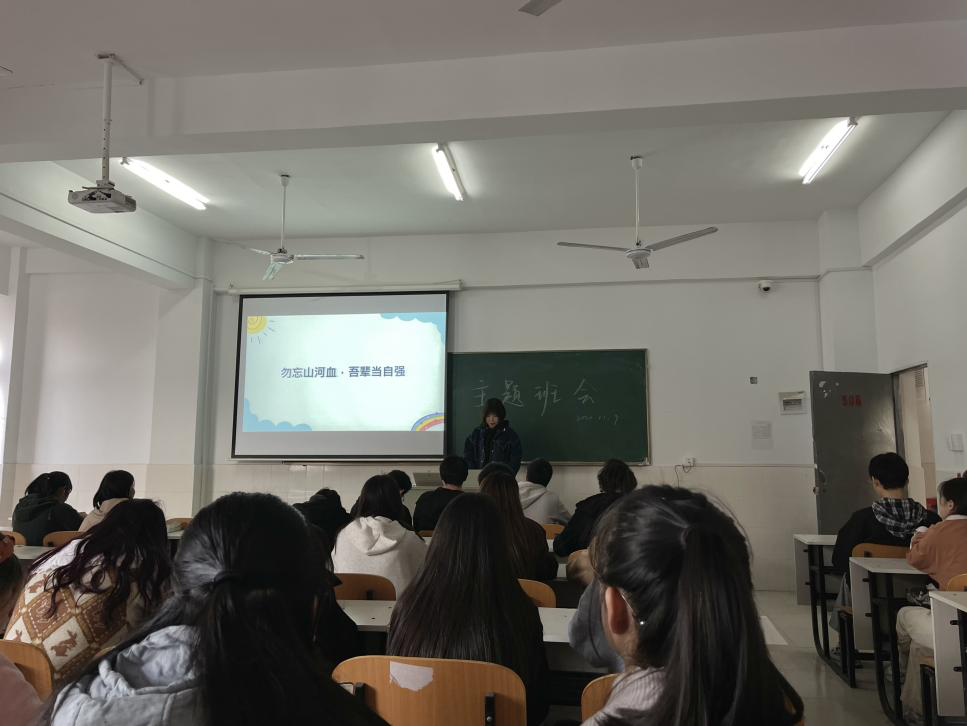 为了加强学生的爱国主义教育和民族精神教育,提升学生的爱国情怀,11月9日17:00,我院20级汉语言文学4班于文传楼506教室开展了以“勿忘山河血,吾辈当自强”为主题的班会活动。班会由辅导员程方茹主持,汉语言文学4班54名同学参会。
