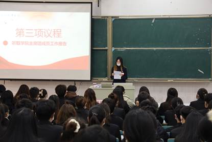 随后,卜美倩老师请在座各位学生代表审议并表决通过了《安徽外国语学院学生会章程》,然后宣读了校学代会代表选举办法,学院学生主席团、学生委员会选举办法,并组织学生代表们举手表决,表决多数通过。之后进行无记名投票选举学院学生会主席团成员、学生委员会委员、学院推荐参加校学代会代表,工作人员收取选票并进行统票。经过短暂的等待后,由卜美倩老师宣读各项投票结果产生的正式名单。