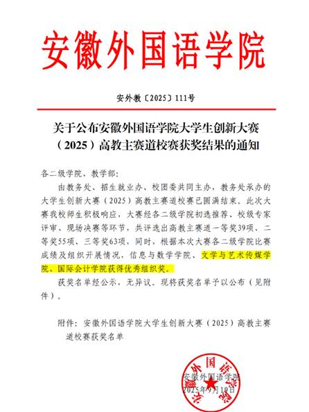文传学院在安徽外国语学院2025年大学生创新大赛高教主赛道校赛中斩获佳绩并获“优秀组织奖”