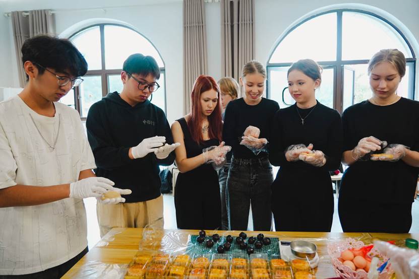 在活动中,老师们向留学生们介绍了中秋节的来源和“嫦娥奔月”的神话故事。留学生们纷纷表示故事生动有趣,第一次制作和品尝中国的月饼,参与感和成就感满满。月饼作为中秋文化的重要载体,承载着中国人“团圆”“思念”的情感密码。即便大家来自不同国家、隔着千山万水,但抬头共沐同一轮明月,手中的月饼一握,这份东方情愫便有了具体的模样。