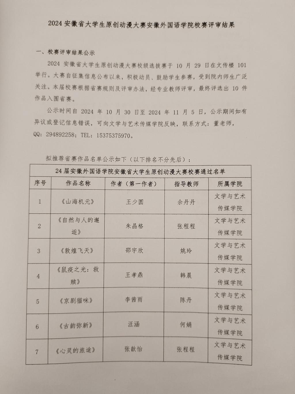 2024安徽省大学生原创动漫大赛安徽外国语学院校赛评审结果
