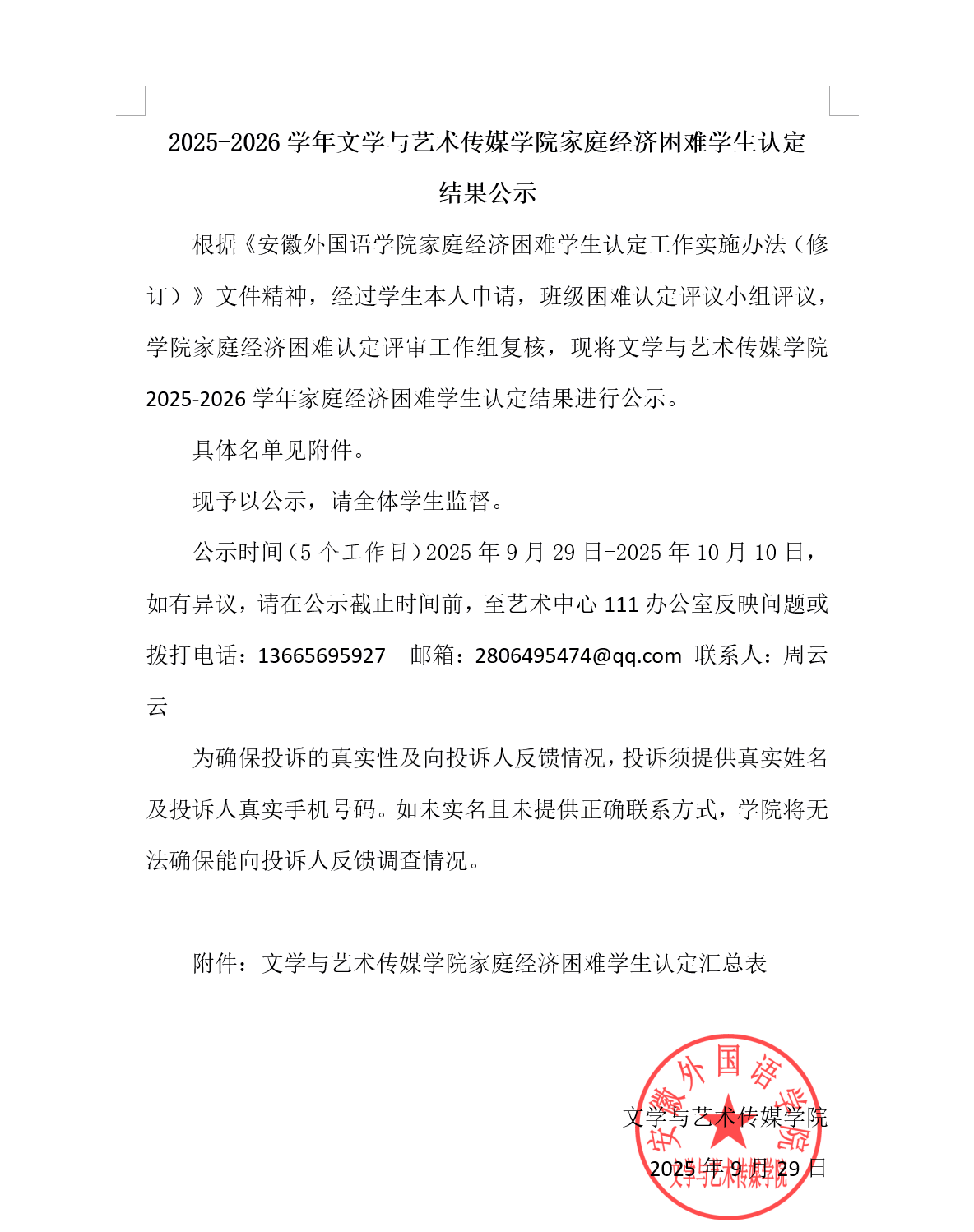 2025-2026学年文学与艺术传媒学院家庭经济困难学生认定结果公示