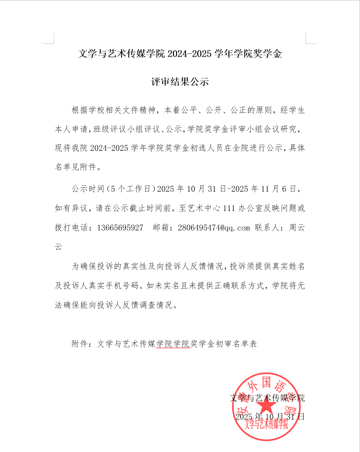 文学与艺术传媒学院2024-2025学年学院奖学金评审结果公示