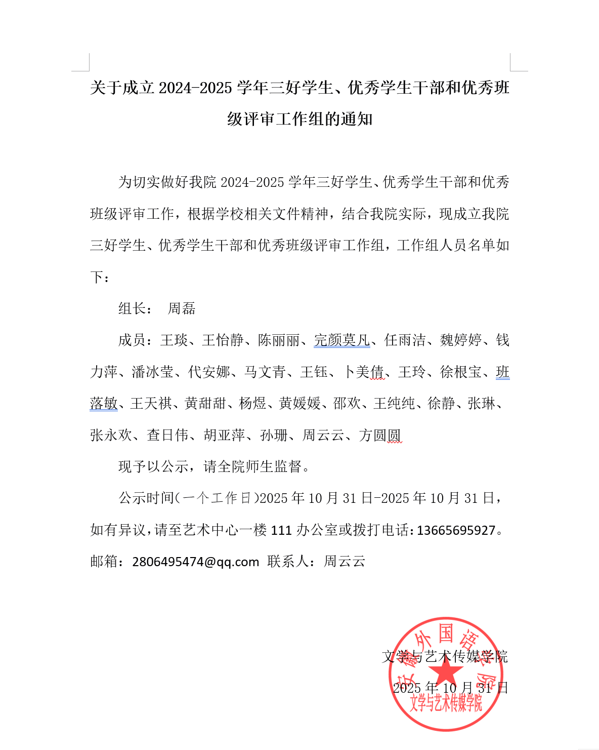 关于成立2024-2025学年三好学生、优秀学生干部和优秀班级评审工作组的通知