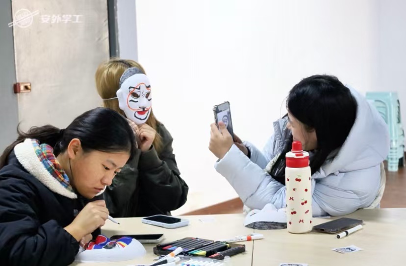 活动伊始,同学们或参考经典案例,或发挥奇思妙想,手持画笔尽情创作。调色、勾勒、填充,一张张空白脸谱在大家的巧手下逐渐变得色彩斑斓、个性鲜明。创作过程中,同学们主动交流创作思路,分享内心的情绪与想法,在协作互动中拉近了彼此距离,现场氛围轻松而热烈。