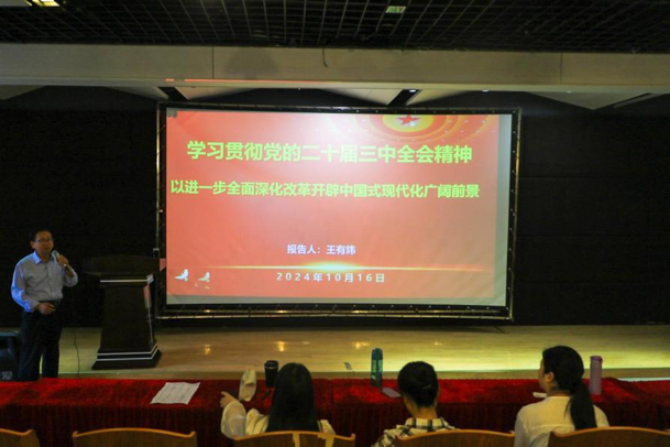 为深入学习领会党的二十届三中全会精神和习近平总书记重要讲话精神,认真学习《中共中央关于进一步全面深化改革推进中国式现代化的决定》,深刻领会党的二十届三中全会报告的重大政治意义、理论意义和现实意义,努力把握其思想精髓、核心要义和实践要求,做到学深学透、入脑入心。10月16日下午,马克思主义学院院长、教授王有炜为国际商务学院全体教职工作专题宣讲。